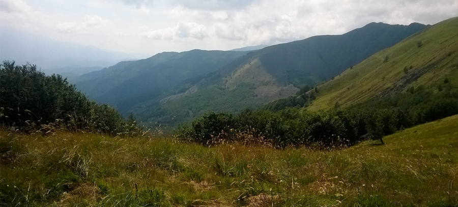 Dal passo di Romecchio (da notare pietre incise dai pastori e il vicino Oratorio di S. Bartolomeo) si segue ancora il sentiero 633 (ora anche GEA) che passa un po’ sotto il crinale, attraverso una brughiera di mirtilli (faggi imponenti).